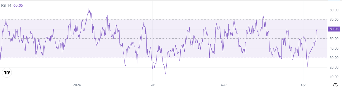 Индекс относительной силы (RSI) BNB за 14 периодов вернулся к отметке около 60, что указывает на улучшение краткосрочного импульса, а не на чрезмерно растянутое движение. Однако динамика BNB пока больше похожа на восстановление, чем на полноценный прорыв.