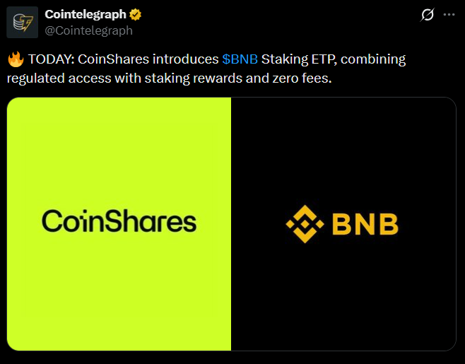 Канал институционального доступа связан с ETF-конвейером, который может изменить восприятие BNB и упростить доступ к нему через традиционные оболочки.