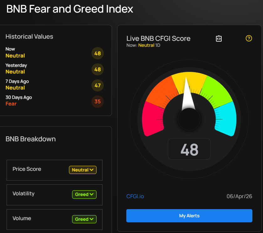 Индекс страха и жадности BNB по данным CFGI.io на 6 апреля 2026 г., около 06:08 (UTC)