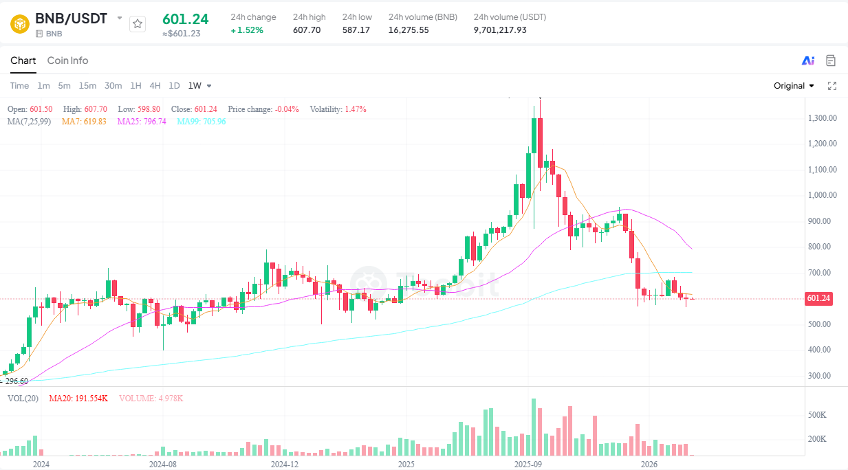 BNB продолжает торговаться в диапазоне восстановления, удерживая зону $591,90–$601,18.
