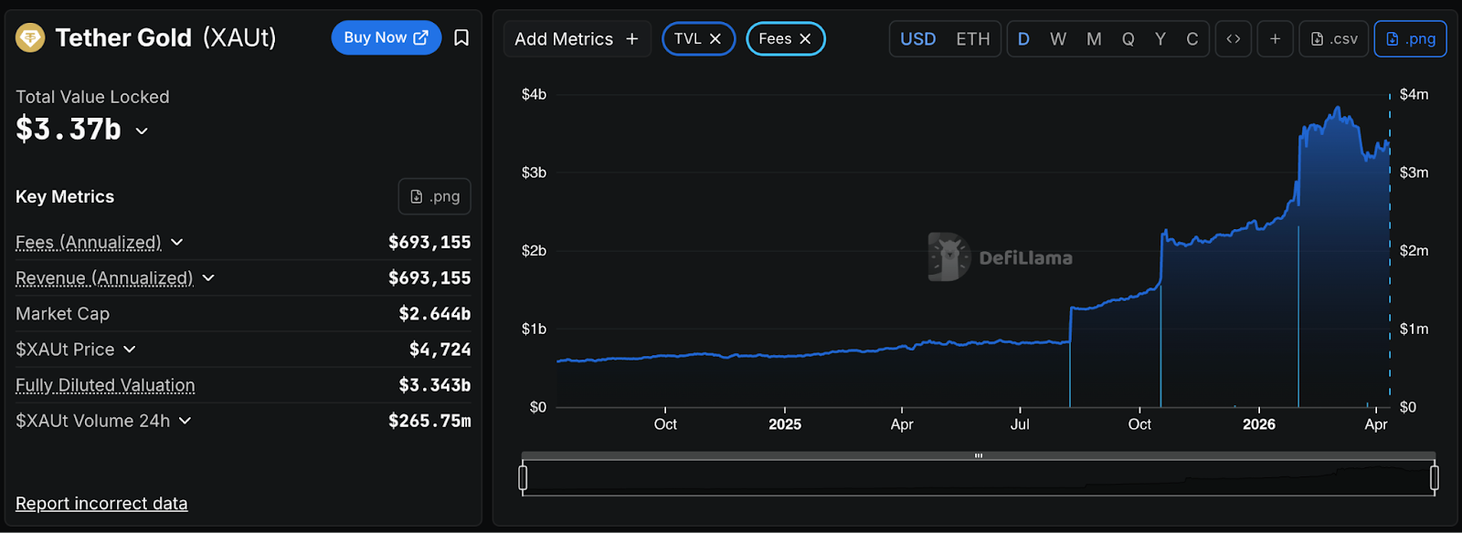 Согласно DeFiLlama, общая заблокированная стоимость (TVL) XAUT достигла $3.37 млрд, соответствуя общему количеству выпущенных токенов. Он принес $693,155 годовых комиссий и дохода, или $5.04 млн совокупно.