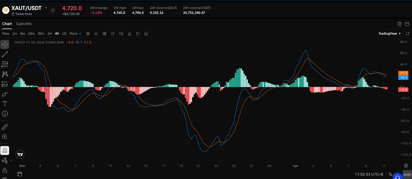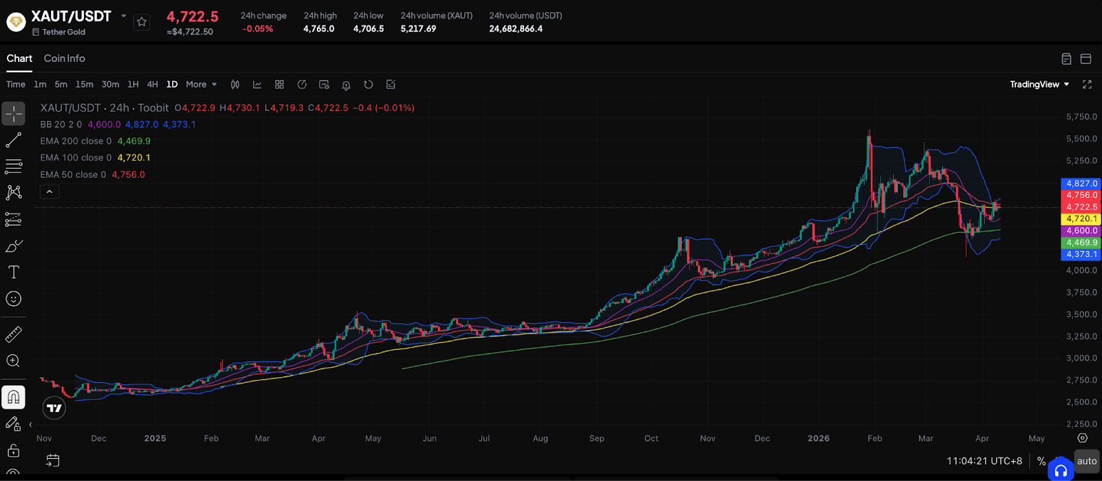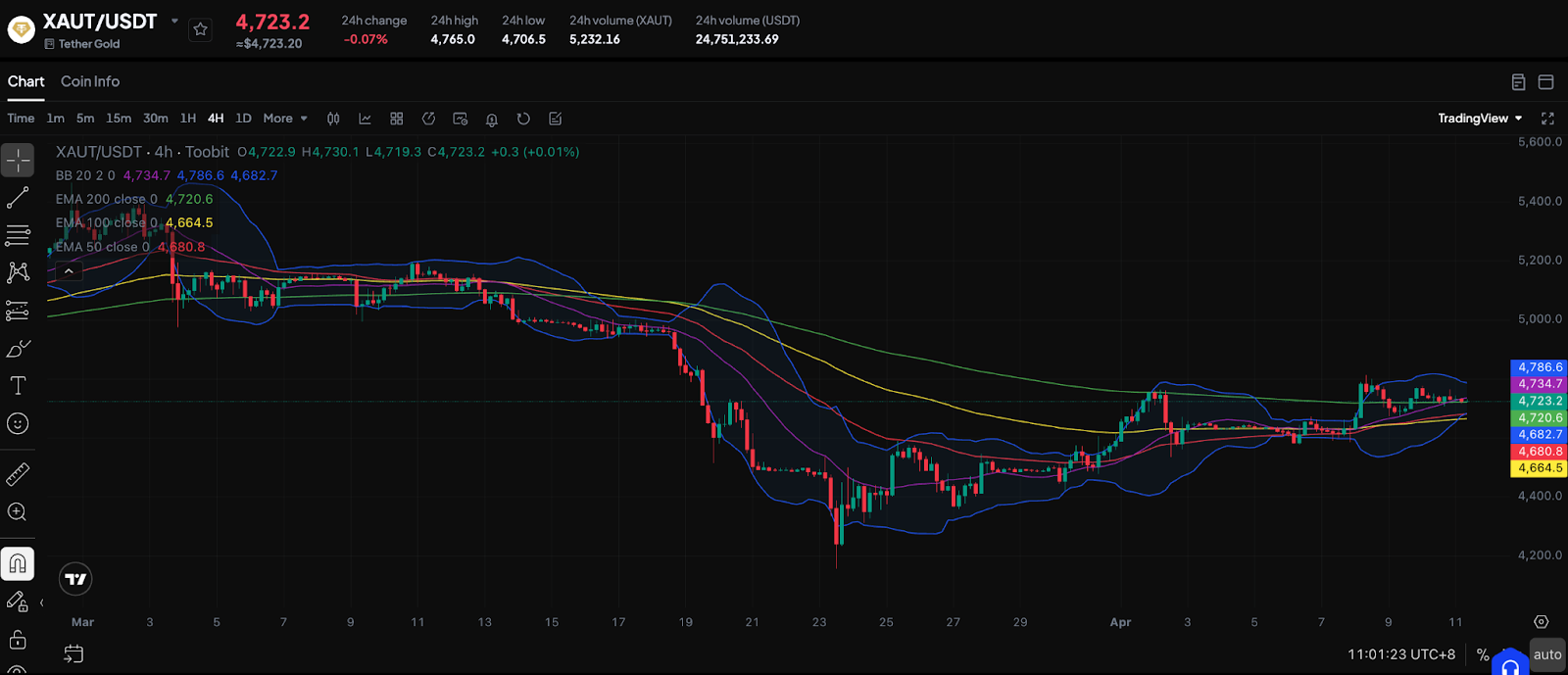 Цена токена XAUT немного снизилась на 0.07% за последние 24 часа на 4-часовом таймфрейме. В настоящее время он торгуется по $4,723.20 на спотовом графике XAUT/USDT.