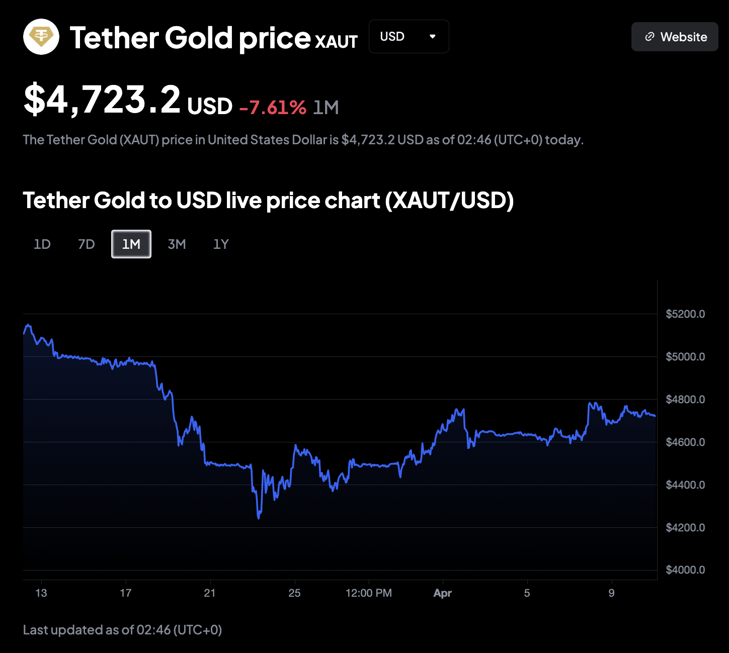 Движение цены XAUT находилось в диапазоне $4,586.67–$4,787.14 с 5 по 11 апреля 2026 года. Текущая цена XAUT снизилась всего на 1.33% от максимума за неделю.