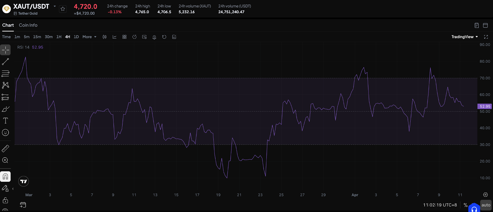 4-часовой индекс относительной силы (RSI) XAUT находится около середины на уровне 52.95. Вероятно, он опустится ниже этого уровня из-за нормального истощения тренда.