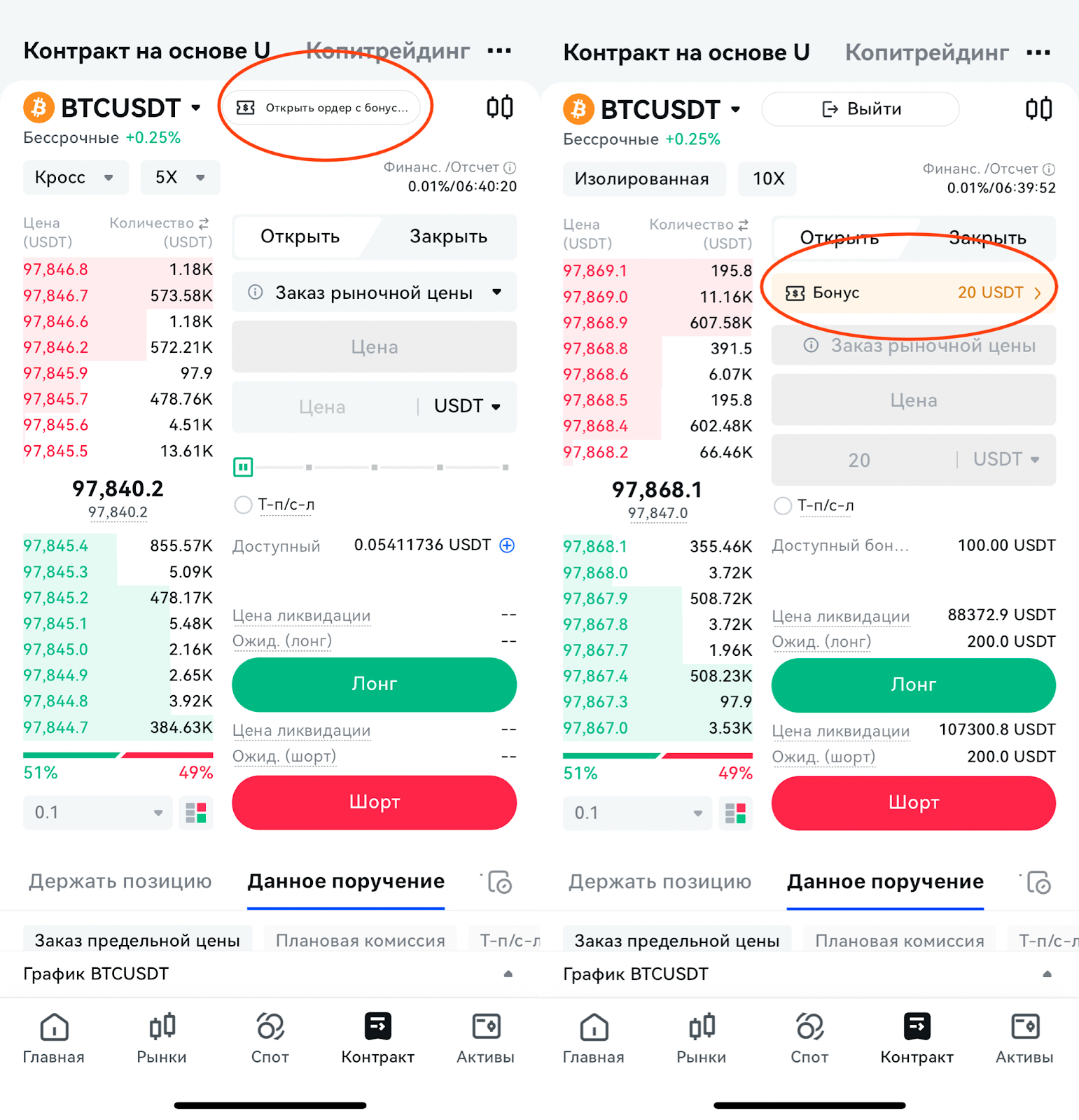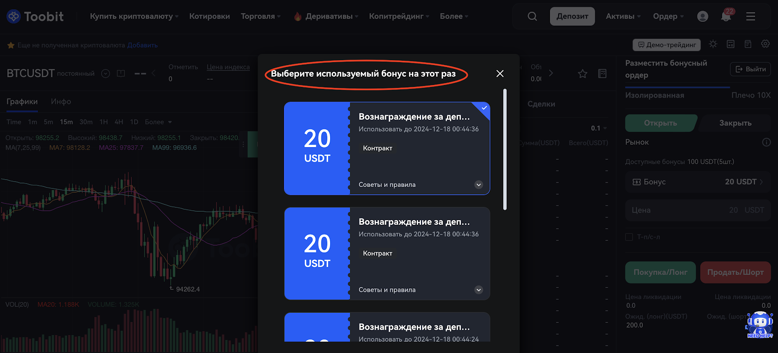 2. В качестве альтернативы, на странице торговли фьючерсами вы также можете нажать кнопку "Открыть ордер с бонусом" в правом верхнем углу и выбрать "Бонус".