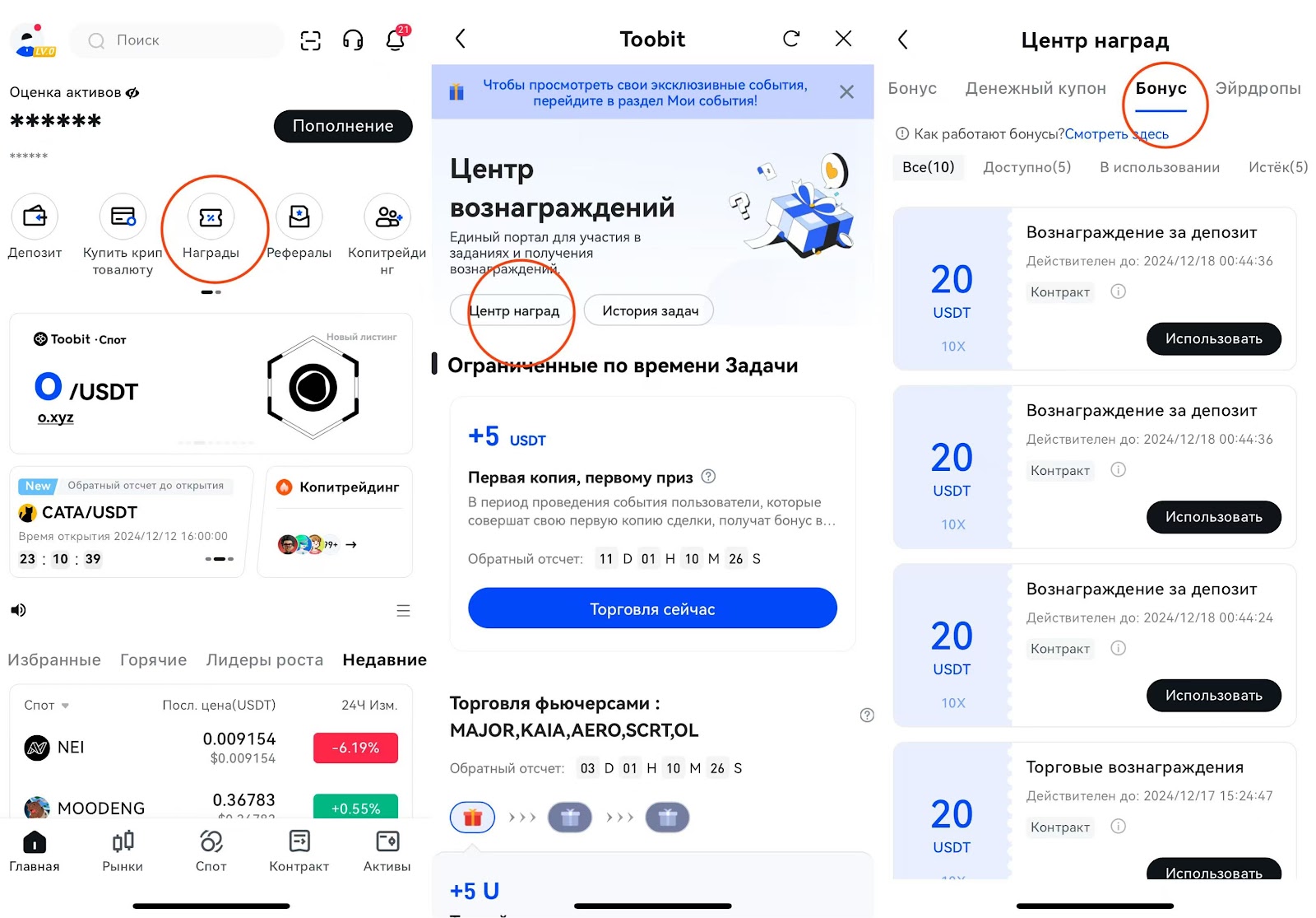 1. Запустите приложение Toobit и перейдите в свой "Центр Вознаграждений". Затем выберите "Центр Наград" и нажмите "Бонус", чтобы получить доступ ко всем доступным фьючерсным бонусам.