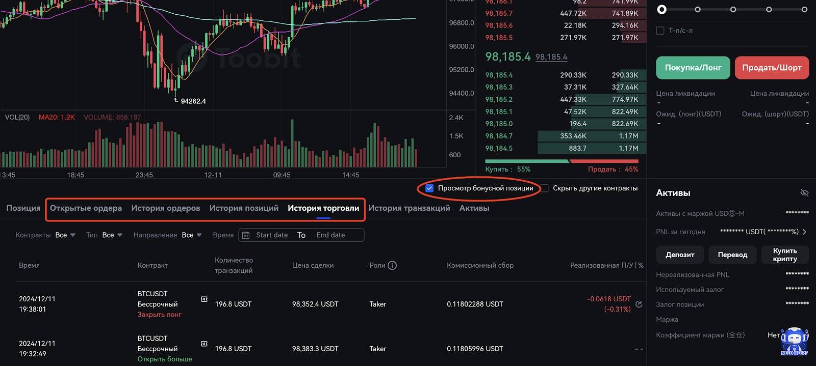 3. Если вам нужно проверить детали бонусной транзакции после закрытия позиции, вы можете выполнить фильтрацию по "Только бонусные позиции", чтобы просмотреть Позиции, Открытые ордера, историю ордеров, историю позиций и историю торговли, связанных с выбранным фьючерсным бонусом.