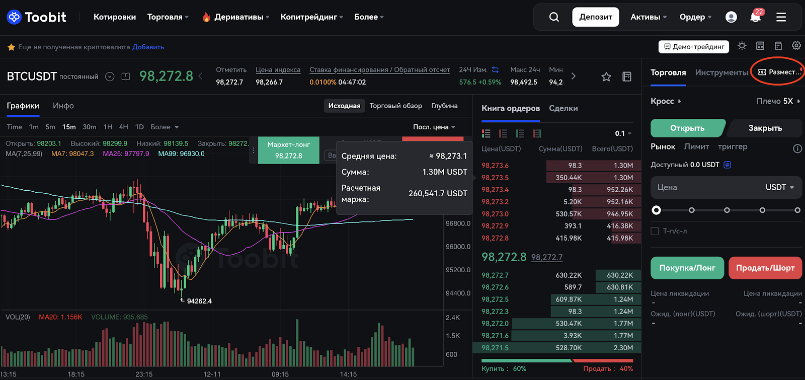 2. В качестве альтернативы, на странице торговли фьючерсами вы также можете нажать на значок "Разместить ордер с бонусом" в правом верхнем углу, чтобы получить доступ к доступным фьючерсным бонусам и просмотреть их.