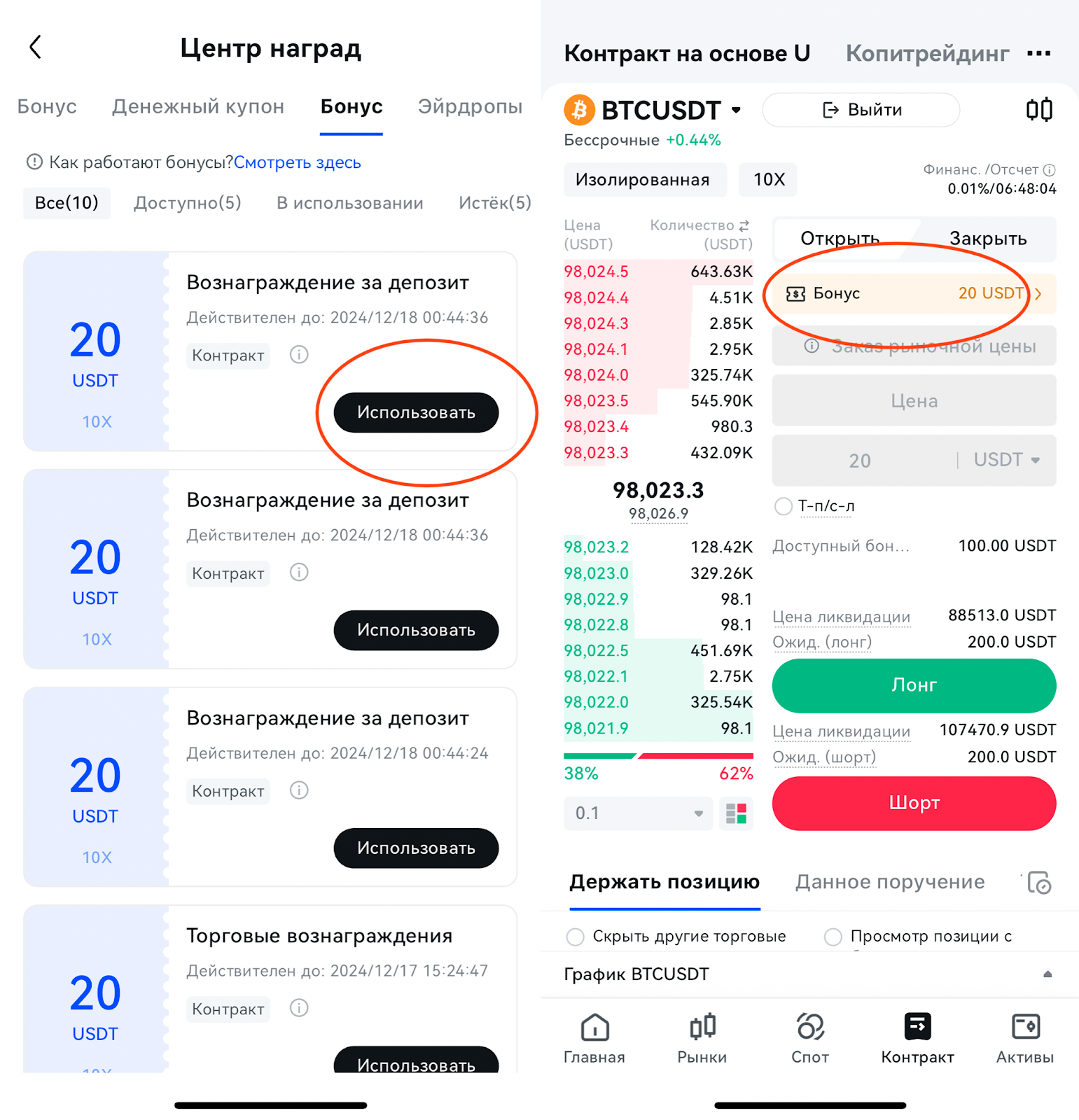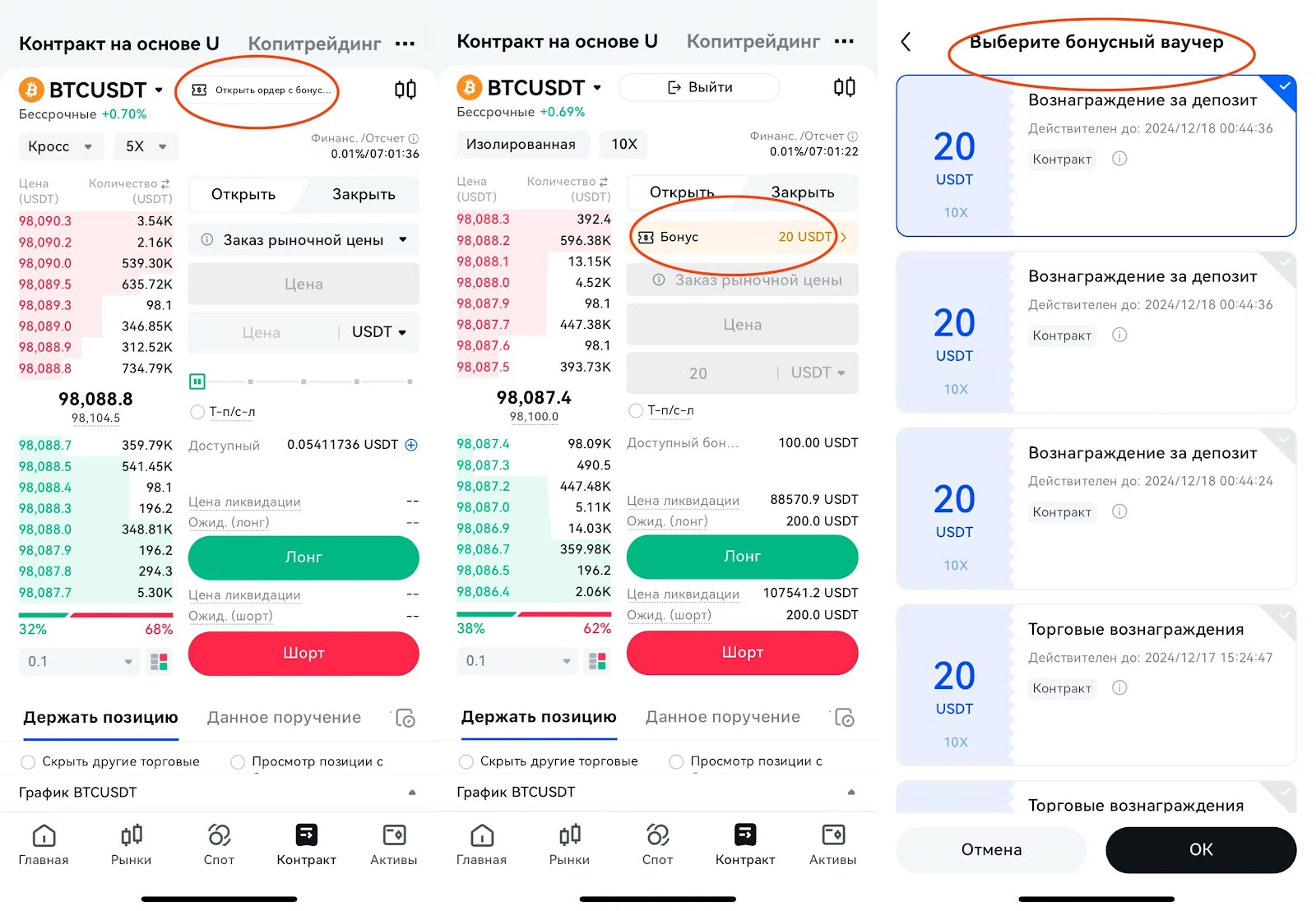 2. Затем перейдите на страницу торговли фьючерсами в приложении. Нажмите "Открыть ордер с бонусом" в правом верхнем разделе приложения и следуйте правилам получения бонуса по фьючерсам, чтобы выбрать бонусный ваучер и открыть позицию.