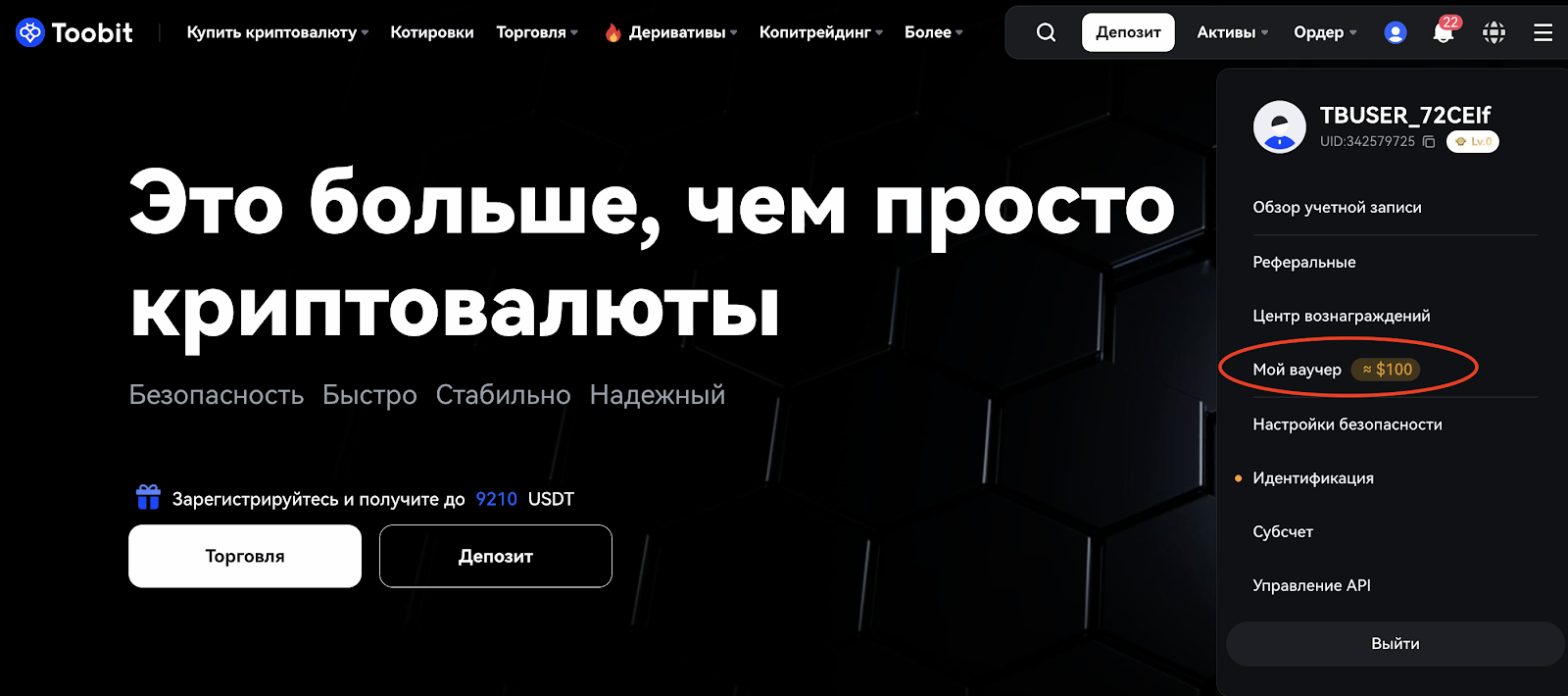1. Войдите в свою учетную запись Toobit на домашней странице Toobit. Нажмите на свой профиль в правом верхнем углу страницы и перейдите в раздел "Мой ваучер" из выпадающего меню, чтобы просмотреть доступные бонусы на фьючерсы.