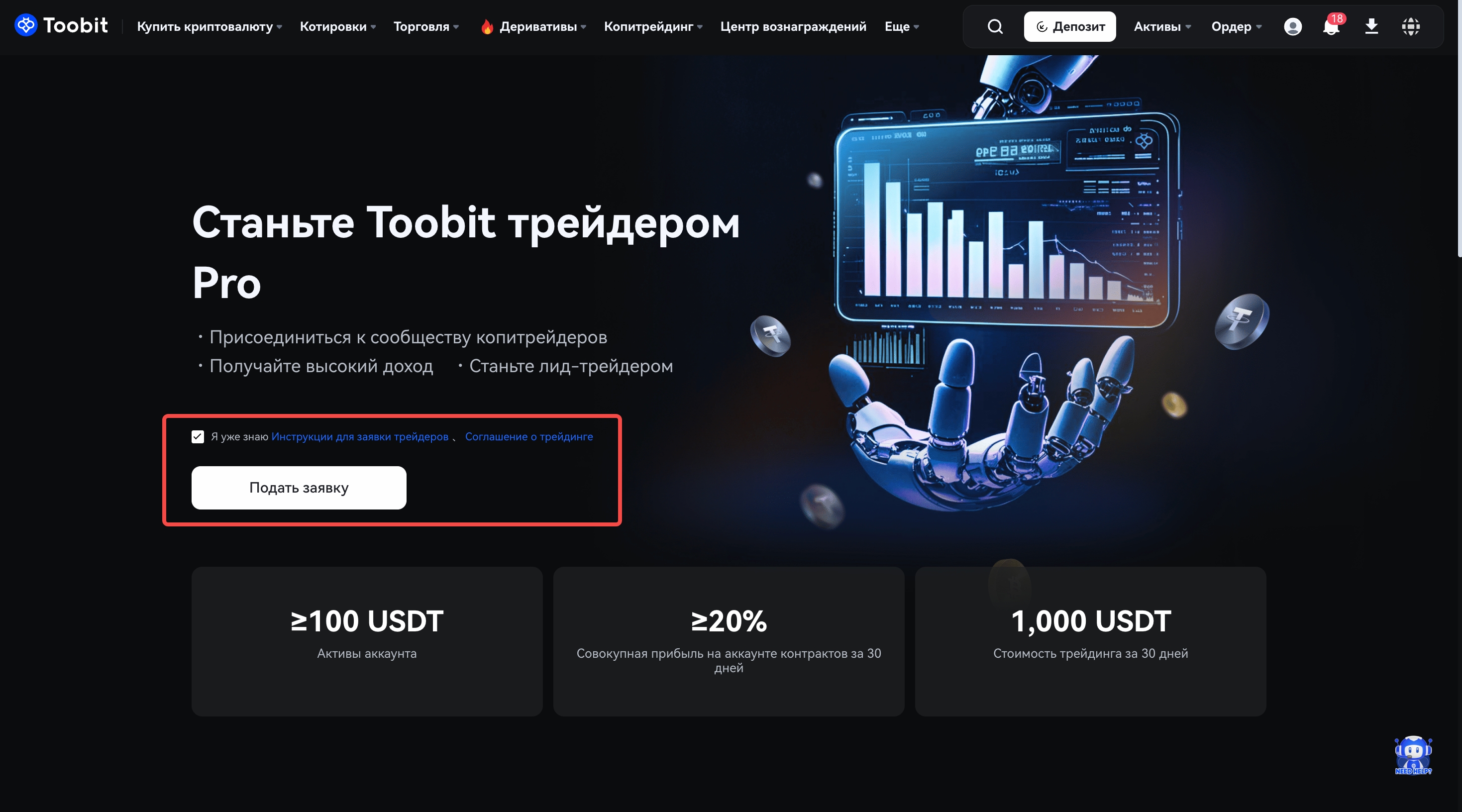 На странице Копитрейдинга вы увидите баннер СтатьПро ТрейдеромToobit. Нажмите кнопку Подать заявку сейчас, чтобы отправить свою заявку.