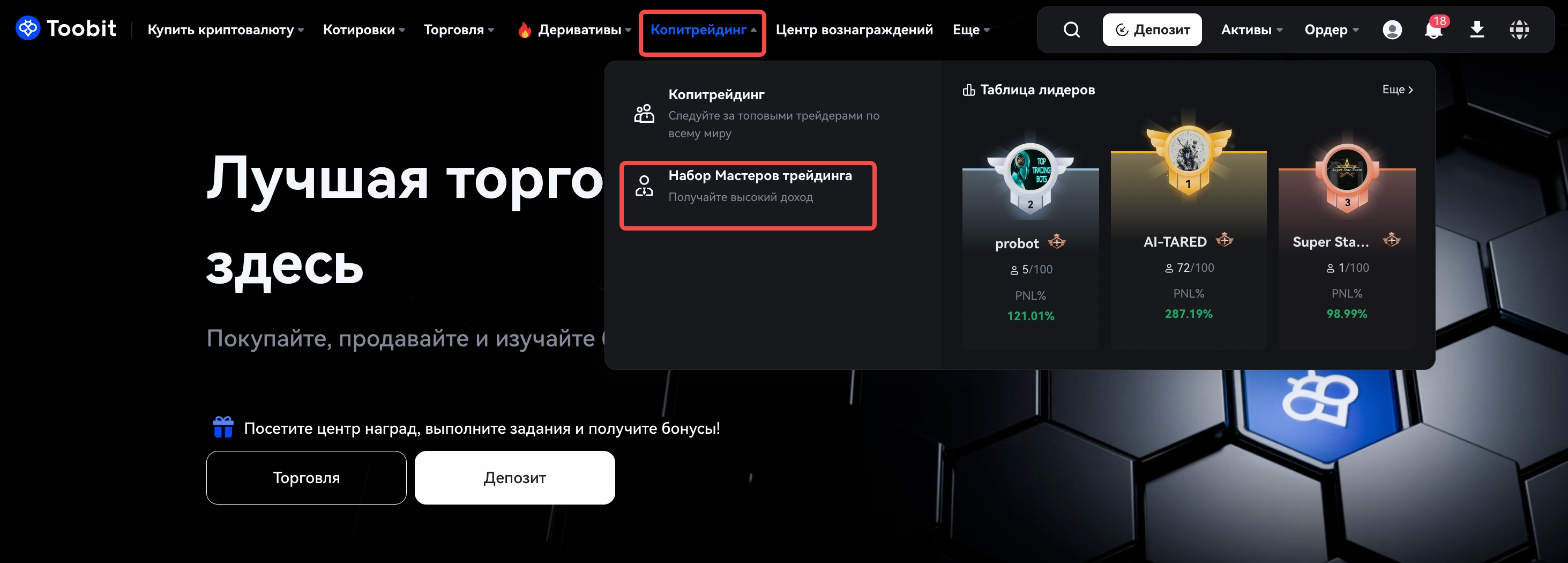 На официальном веб-сайте Toobit наведите курсор мыши на Копитрейдинг. Затем прокрутите вниз и выберите СтатьПро Трейдером. Вы попадете на страницу копирования сделок.