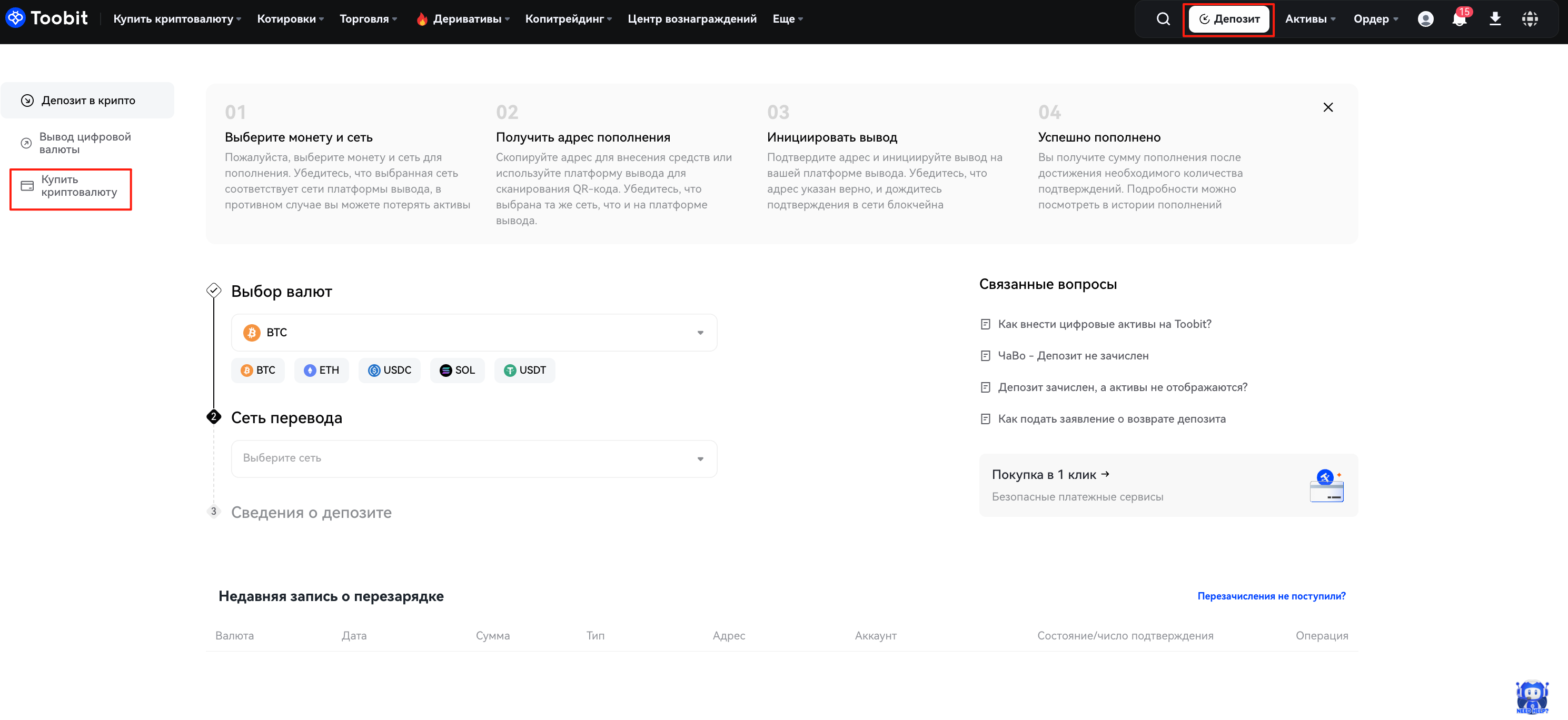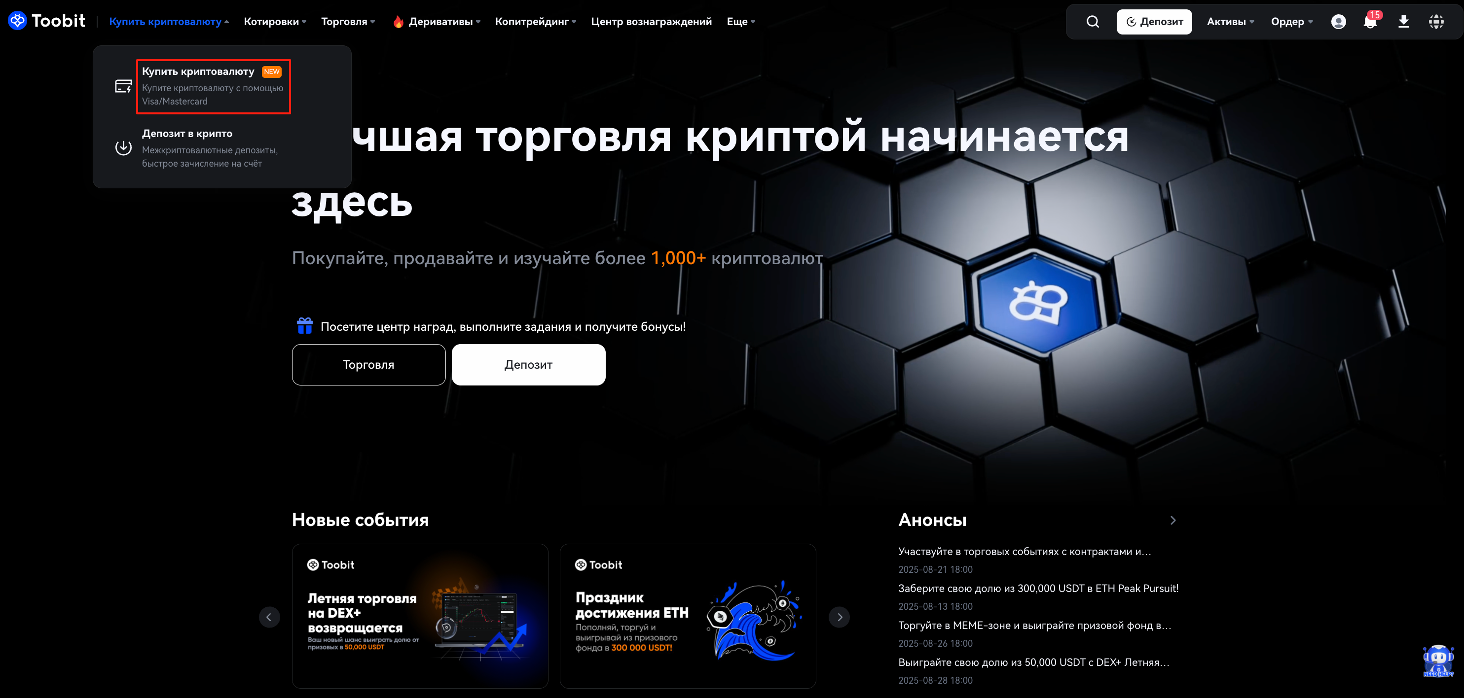 Посетите toobit.com и войдите в свою учетную запись. В верхней части навигации выберите "Купить криптовалюту".
