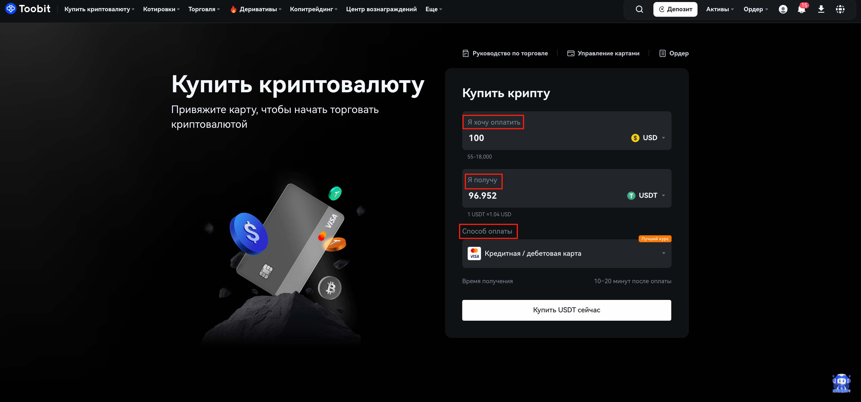 Toobit предлагает простой и эффективный способ покупки криптовалют с помощью кредитных/дебетовых карт. Всего за несколько шагов ваша покупка будет зачислена непосредственно на ваш счет.