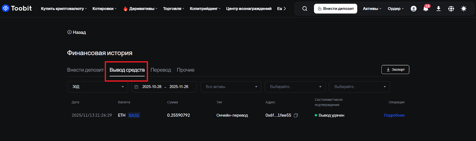 В этой статье объясняется, как проверить статус ваших выводов средств на Toobit. Выполните следующие шаги, чтобы быстро просмотреть и понять ход вашего вывода средств.