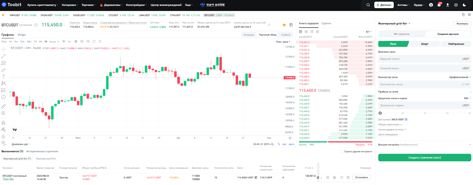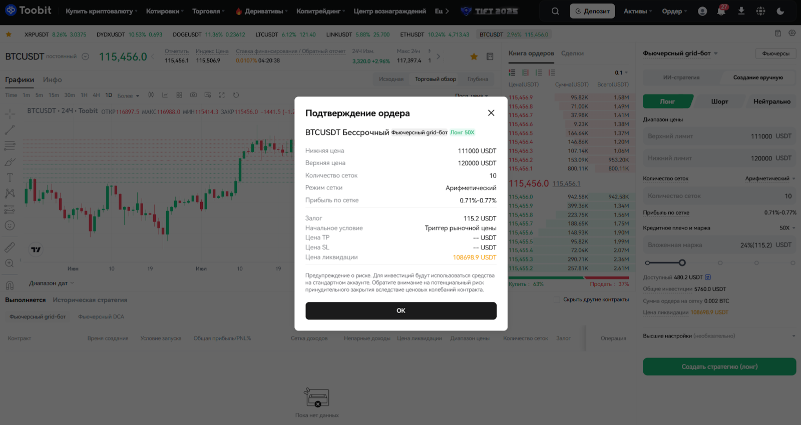 Торговля по фьючерсной сетке - это автоматизированный инструмент для разработки стратегий. Он не является финансовым или инвестиционным советом. Результаты могут варьироваться в зависимости от рыночных условий и настроек сетки. Торговля криптовалютами сопряжена со значительными рисками - торгуйте ответственно и в пределах допустимого риска. Используя эту функцию, вы соглашаетесь с условиями и положениями Toobit.