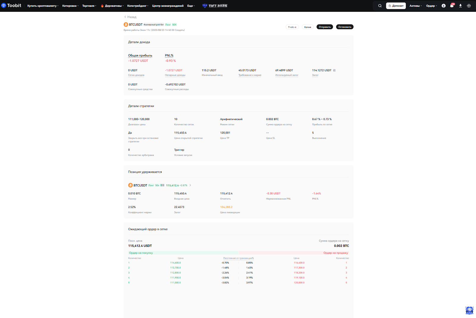 Вы можете нажать Подробнее на странице запущенных ботов, чтобы получить дополнительную информацию, включая текущее состояние вашего бота по фьючерсной сетке.
