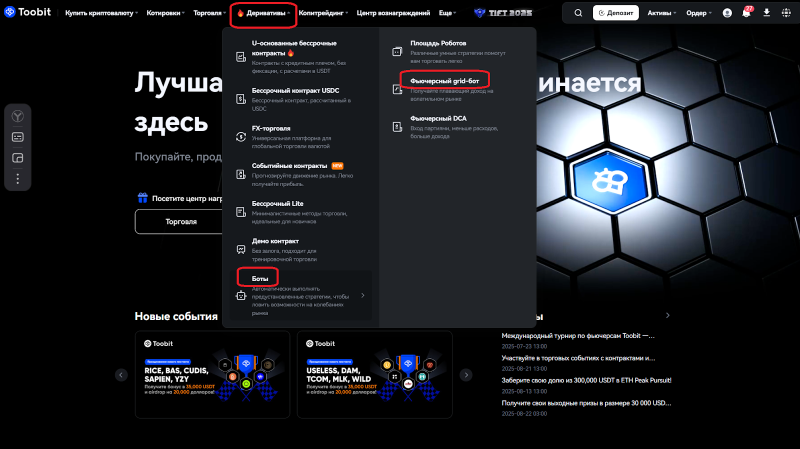 В верхнем меню нажмите Деривативы → Боты → Фьючерсная Сетка.