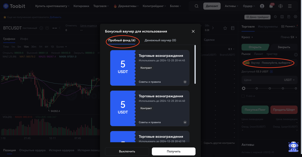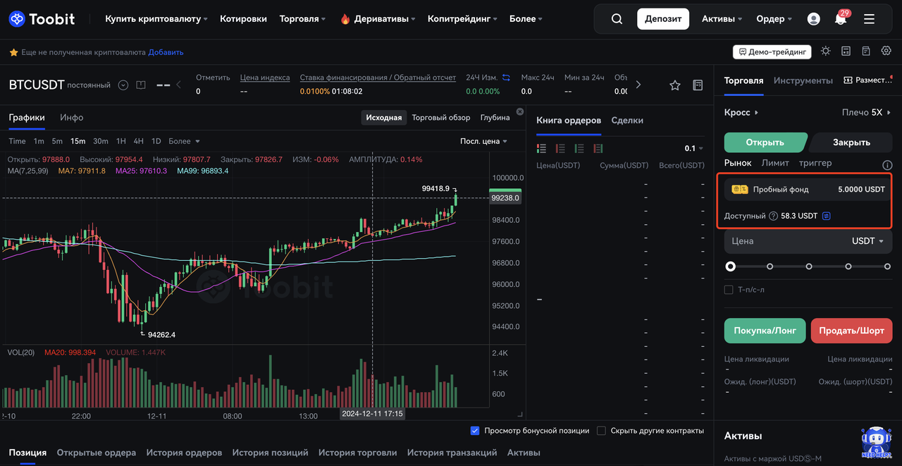 Пробные средства, предоставляемые компанией Toobit, — это промо-ваучер, который позволяет пользователям познакомиться с торговлей бессрочными фьючерсами с прибылью в USDT практически без личных инвестиций. Он покрывает расходы на открытие позиции, торговые сборы, комиссии за финансирование и даже компенсирует торговые потери.