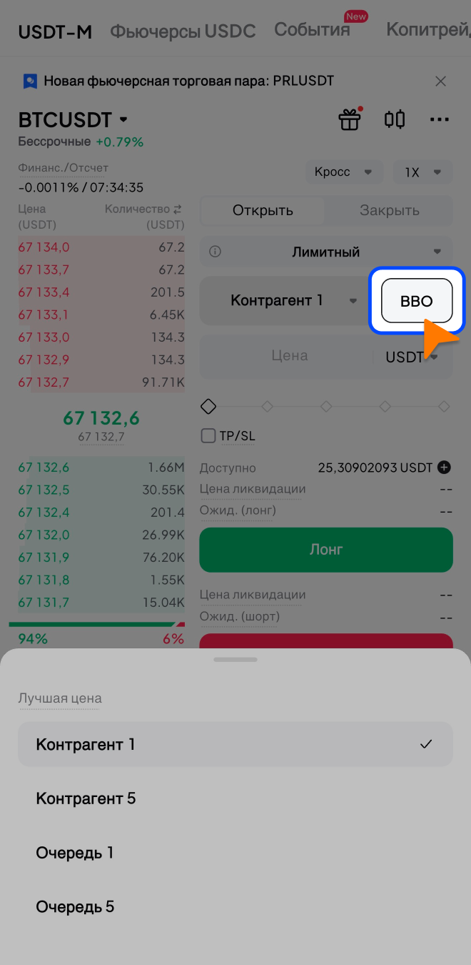 Ордера BBO ориентируются на выбранный уровень книги ордеров и не требуют ручного ввода цены. Это позволяет ордерам оставаться согласованными с текущими рыночными ценами и повышает эффективность исполнения.