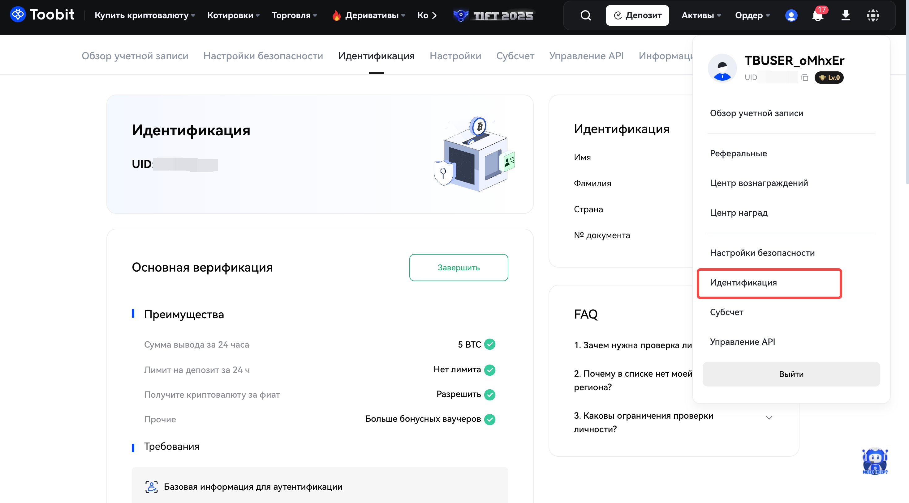 - Верификация аккаунта: Перейдите в 【Идентификация】 для базовой и расширенной верификации. После завершения базовой верификации вы можете совершать вывод средств, торговать фиатом и настраивать API, а также увеличить лимит на сделки, пройдя расширенную верификацию.