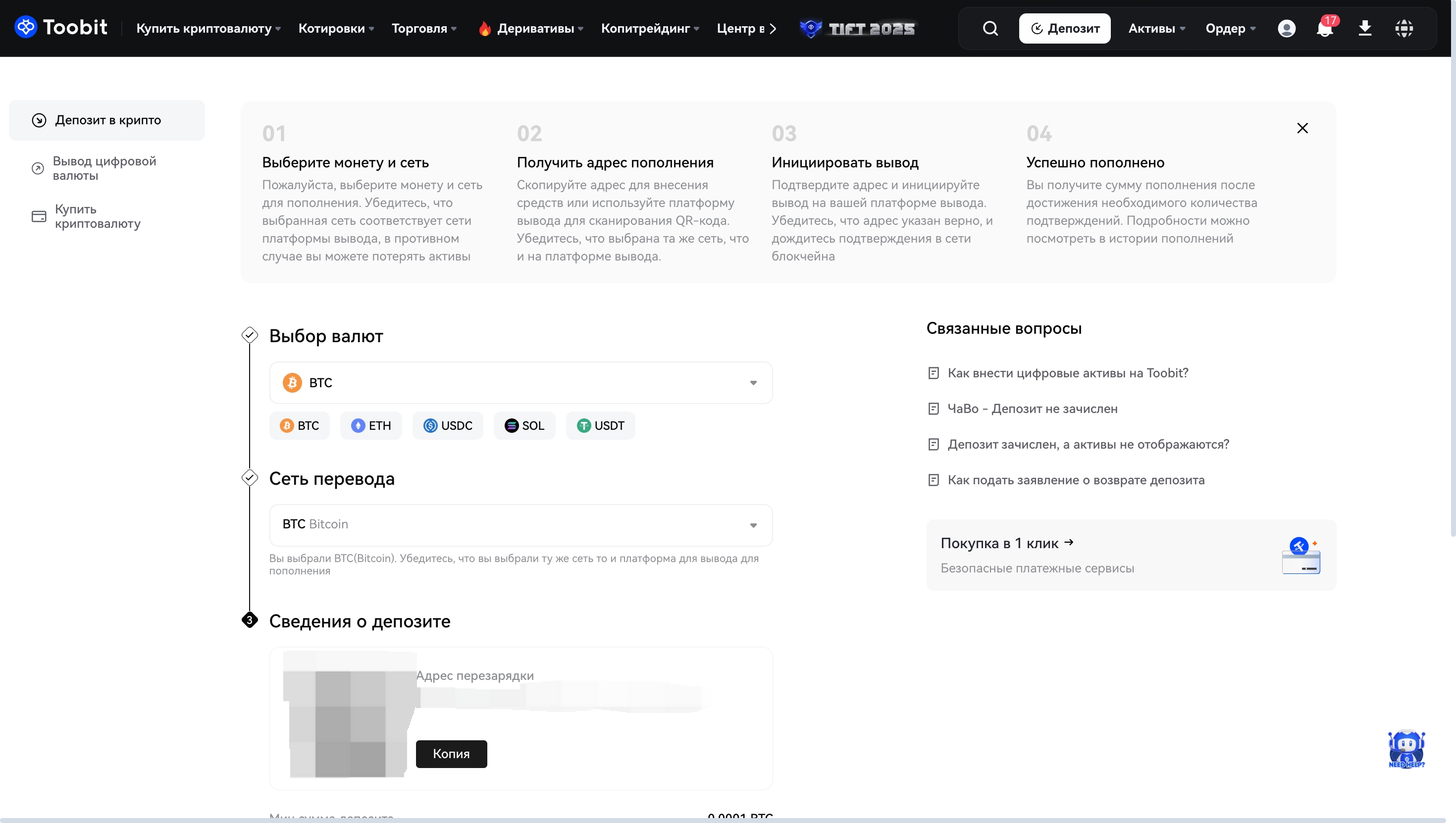- Депозит: Если у вас ещё нет активов на вашем аккаунте Toobit и вам нужно перевести активы с другой платформы или кошелька, вы можете зайти в [Активы] - [Спотовый аккаунт] и выбрать [Депозит], выбрать монеты для депозита и скопировать адрес. Обратите внимание на информацию с подсказками на странице депозита, после чего сможете внести свои цифровые активы.