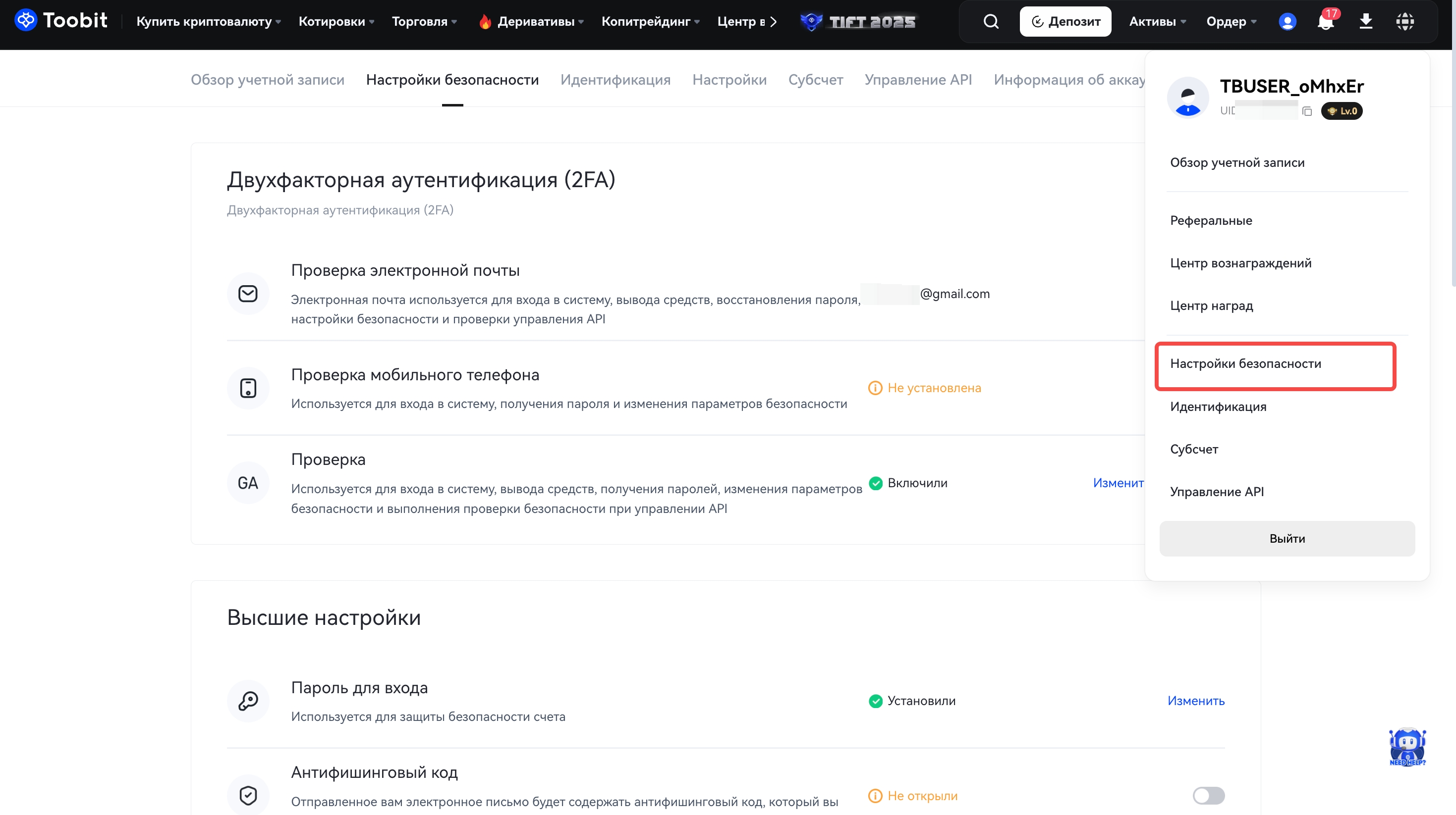 - Настройки безопасности: Чтобы повысить уровень безопасности аккаунта, защитить ваши активы и обеспечить бесперебойную торговлю на платформе, мы рекомендуем включить двухфакторную аутентификацию. Перейдите в [Настройки безопасности] и активируйте любые два пункта безопасности: email, мобильный телефон или Google-аутентификацию. Кроме того, вы также можете продолжить с расширенными настройками, паролем для активов и антифишинг-кодом, чтобы дополнительно защитить безопасность вашего аккаунта.