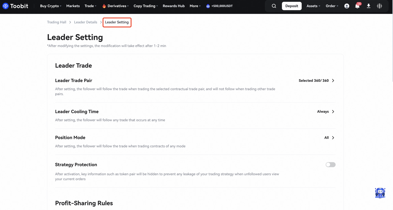 Click on the "Leader Settings" button in the top right corner to manage your Leader Trade, Profit-Sharing Rules, Following Limit, and Private Leading. Once saved, a confirmation message will appear.