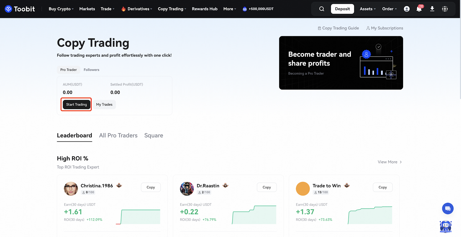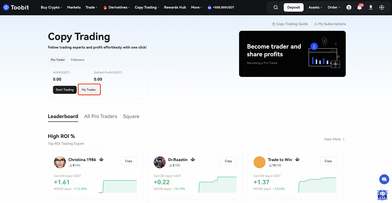 - The process on the Toobit App is similar to the web version. Simply open the app and tap the Copy Trading shortcut on the homepage to get started. Once you're approved as a Pro Trader, you can begin leading trades and manage your activity through My Copy Trades.