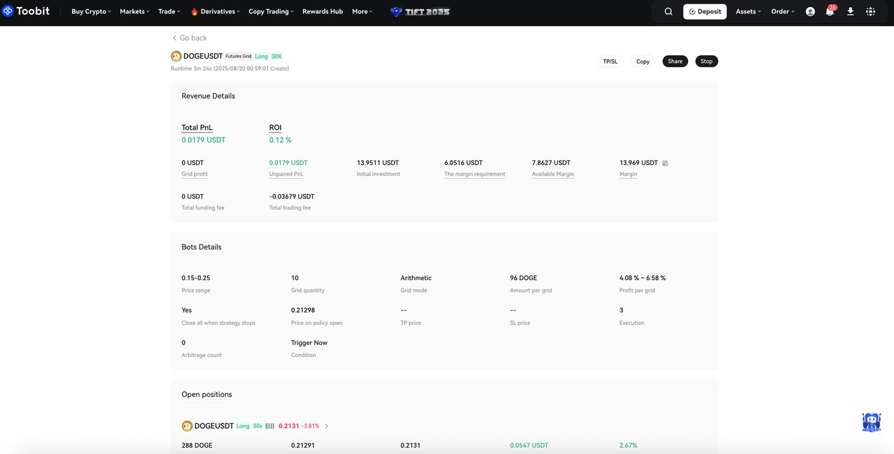 You can also adjust the investment amount or add TP/SL to your position from the details. Please note that the additional investment only serves to maintain the position to avoid liquidation. It does not reset the Grid Bot parameters.