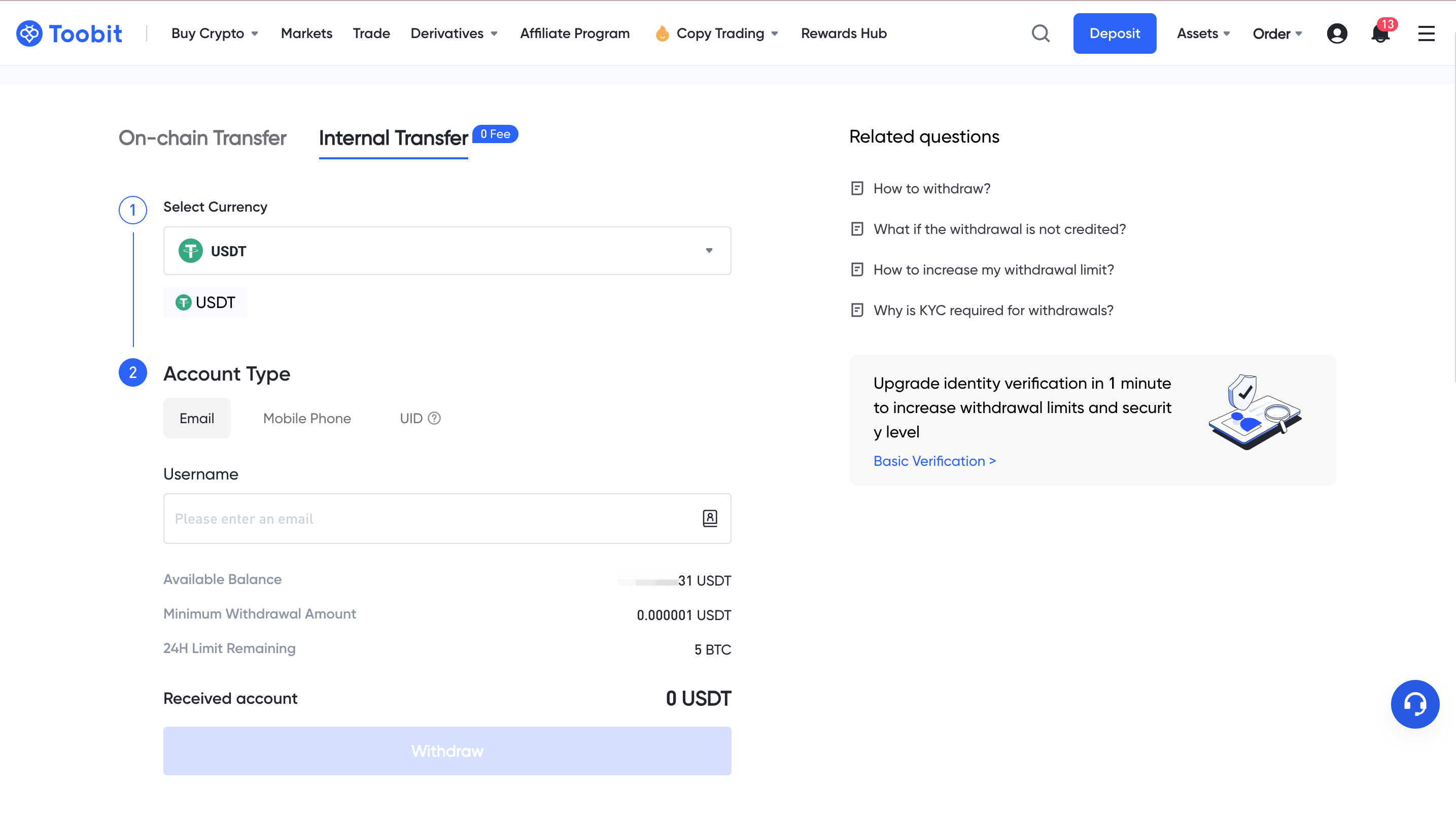 - Internal transfers are designed for seamless and instant fund transfers between Toobit accounts. This method is ideal for quick transfers with no blockchain involvement.