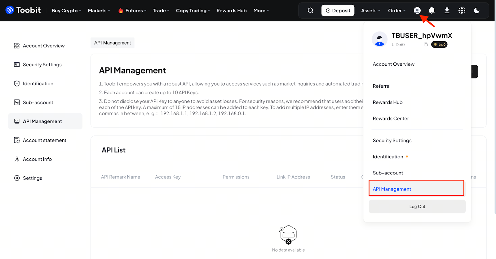 On the Toobit trading page, click the user icon in the top right corner of the interface, then select [API Management] from the dropdown menu.