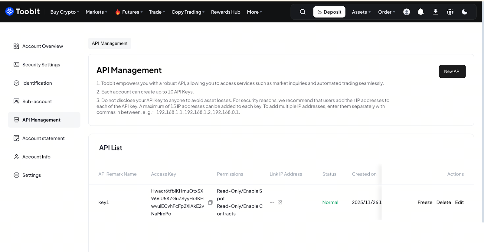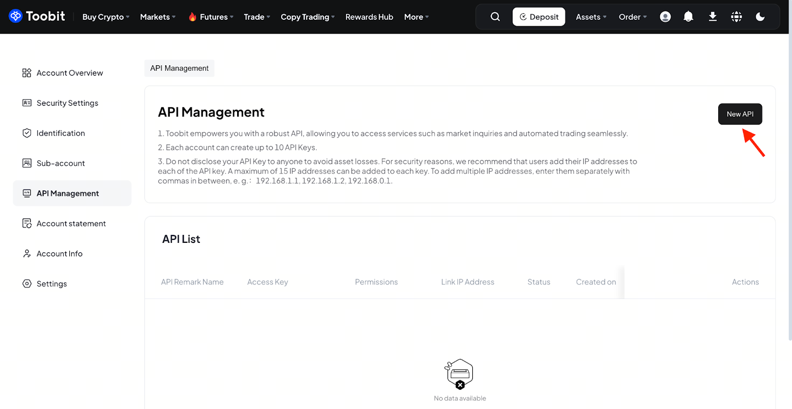 Each Toobit account is limited to creating a maximum of 10 API Keys.