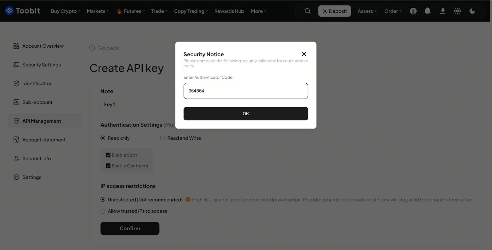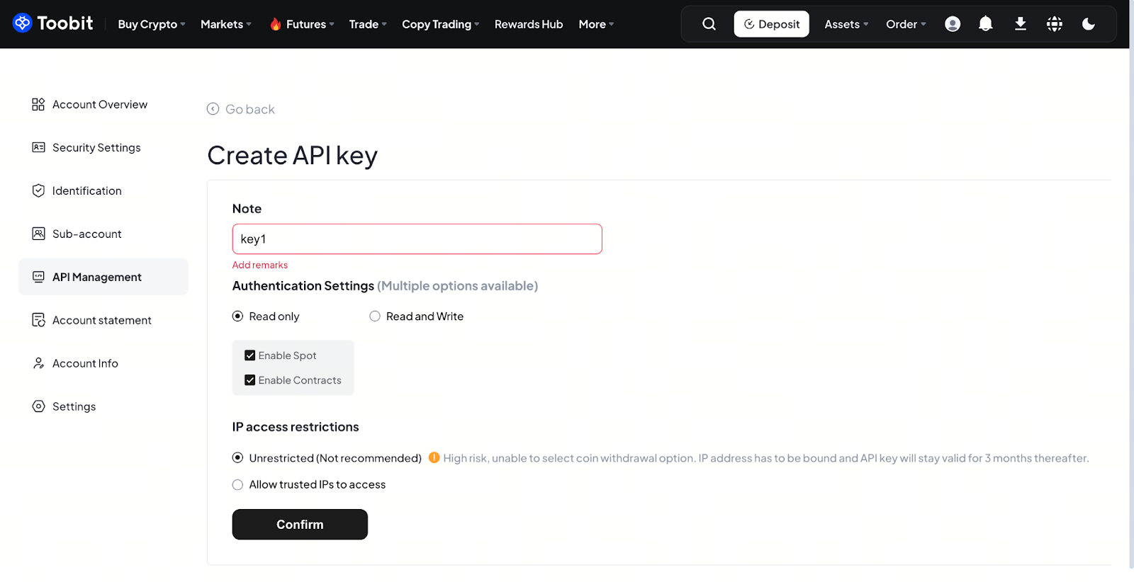 — The creation of API keys is available via the PC/website version of Toobit; this function is not supported on the Toobit mobile app.