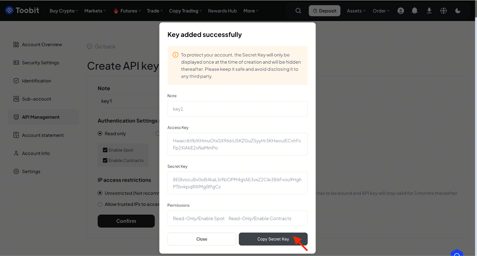 To safeguard the security of your Toobit account, the Secret Key will only be displayed once at the time of API key creation and will be hidden permanently afterward. Please: