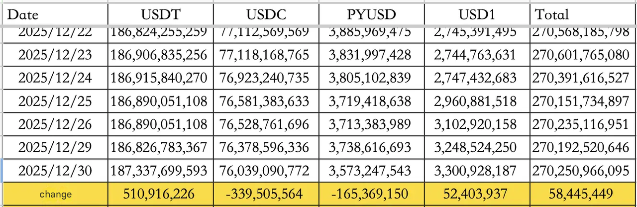 Daha büyük gösterge likiditeydi: stabilcoinler 30 Aralık'ta net +58,45M$ giriş gösterdi, USDT +510,92M$ ile öne çıkarken USDC -339,51M$ yumuşadı. Toplam stabilcoin arzı 270,25B$ olarak belirtildi.