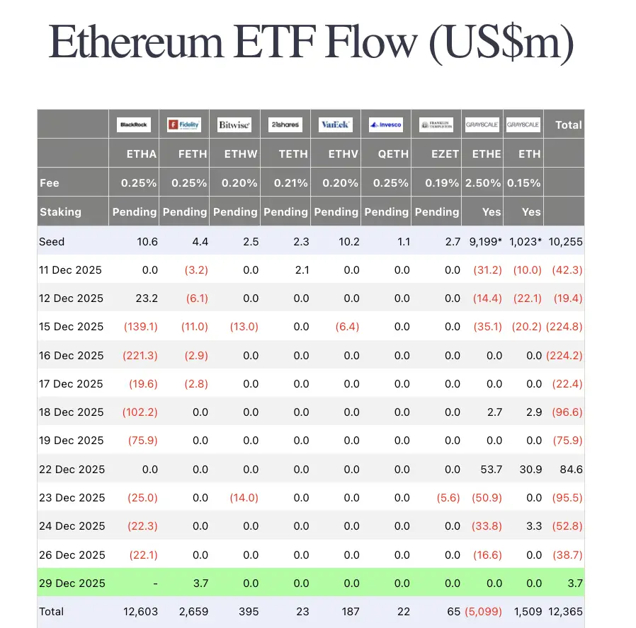 Spot ETF akışları hala temiz bir rüzgar etkisi yaratmadı. 29 Aralıkta, BTC ETF'leri -11,4M$ iken ETH ETF'leri +3,70M$ oldu, ancak akışların bir büyük ihraççının verileri olmadan raporlandığı not edildi, bu nedenle okuma yönsel olarak faydalı, ancak tam değil.