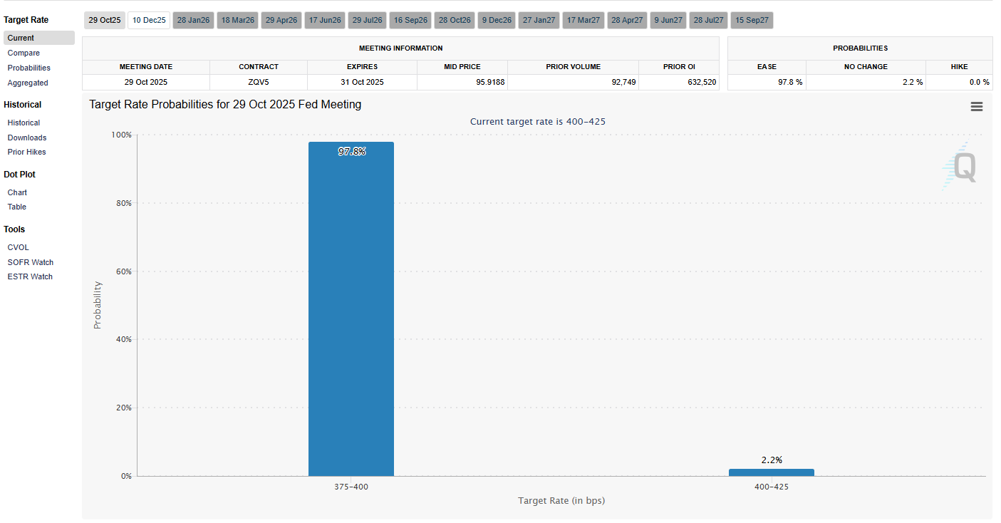 FedWatch, 25 Ekim'de %97.8 ihtimalle 25 bp faiz indirimi öngörüyor, bu da güvercin dönüş anlatısını pekiştiriyor.