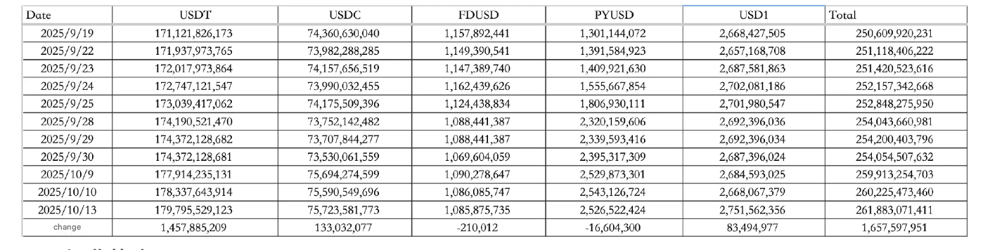 Stablecoin likiditesi yeniden arttı. 10-13 Ekim tarihleri arasında girişler 1.66 milyar dolar seviyesine ulaştı, bu miktarın 1.46 milyar doları USDT'ye ve 133 milyon doları USDC'ye aktı, böylece toplam stablecoin arzı 261.88 milyar dolara çıkarak yeni bir döngü zirvesine ulaştı.