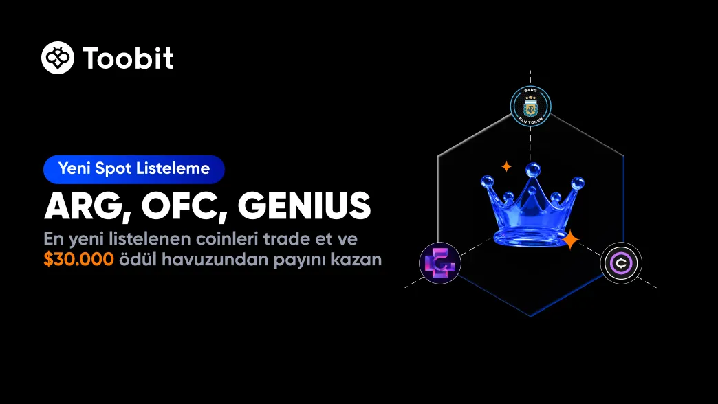 ARG, OFC, GENIUS resmen Toobit'te yerini aldı ve bunu büyük bir şekilde kutluyoruz. Özel ticaret kampanyamıza katılın ve 10,000 USDT Bonus ve 20,000 $ değerinde token airdrop dahil olmak üzere 30,000 $ ödül havuzundan payınızı alın.