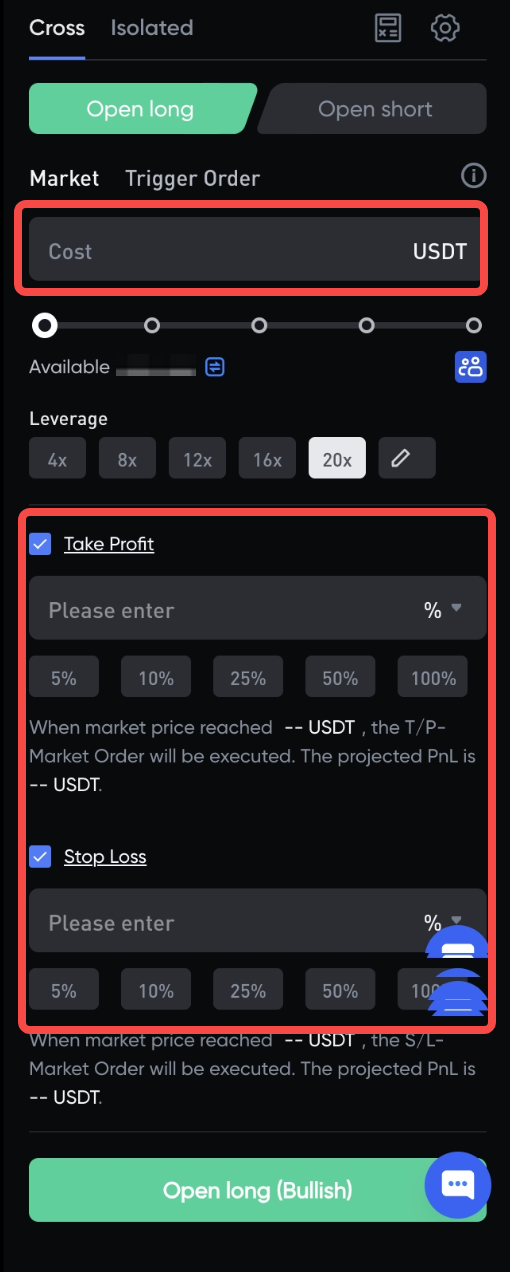 TP/SL: Kar al ve zarar durdur emirlerini, karın yüzdesine veya belirli bir fiyata göre tetiklenecek şekilde ayarlayabilirsiniz.