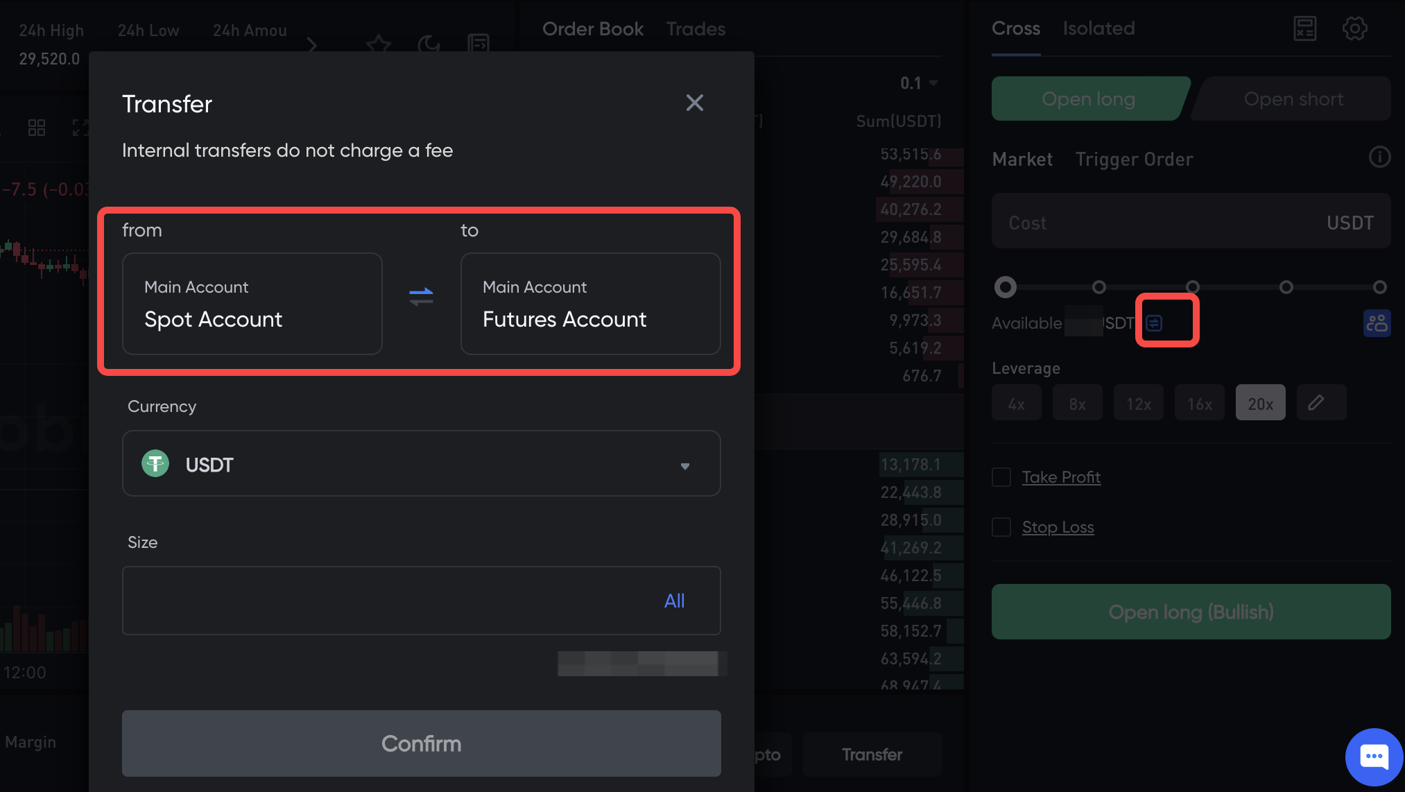 Lite Perpetual'a girdikten sonra, varlıklarınızı Vadeli İşlemler Hesabınıza aktarmanız gerekecek. Bunu yapmak için sayfanın sağ tarafına gidin. "Piyasa" altında ve "Kaldıraç" üzerinde "Mevcut: 0.0 USDT" yazısını göreceksiniz. Yanındaki mavi düğmeye tıklayın ve varlıkları aktarmak için bir açılır pencere belirecektir. Ardından, ticarete başlamak için varlıklarınızı Spot Hesabınızdan Vadeli İşlemler Hesabınıza aktarabilirsiniz.