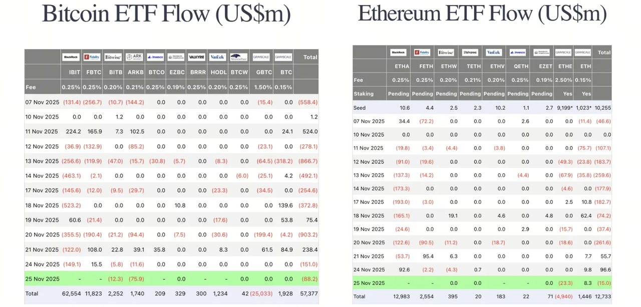 Dòng tiền ETF lại phân kỳ. Dựa trên dữ liệu ngày 24 tháng 11, BTC ETFs ghi nhận 151 triệu USD dòng tiền ra ròng, trong khi ETH ETFs thu được 96,6 triệu USD dòng tiền vào ròng. Nhu cầu SOL ETF vẫn tập trung vào BSOL của Bitwise, thay vì các nhà phát hành khác.