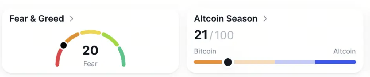Tâm lý được nâng cao, nhưng sự thận trọng vẫn tồn tại; Chỉ số Sợ hãi và Tham lam tăng lên 20 và Chỉ số Altcoin giảm nhẹ xuống 21.