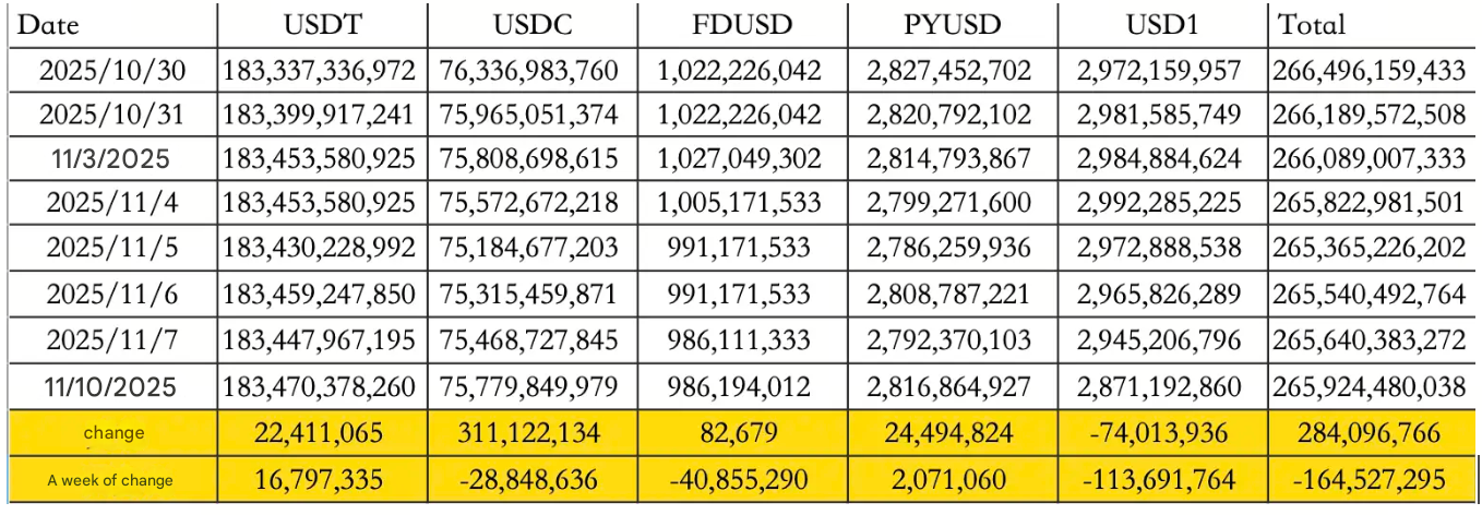 Tổng kết một tuần thay đổi, stablecoin ghi nhận dòng tiền ra ròng là 164,53 triệu USD, do 28,85 triệu USD rời khỏi USDC và 16,79 triệu USD chảy vào USDT. Tổng cung lưu hành của stablecoin hiện tại là 265,92 tỷ USD, cho thấy sự co lại nhỏ nhưng vẫn duy trì mức thanh khoản mạnh mẽ.