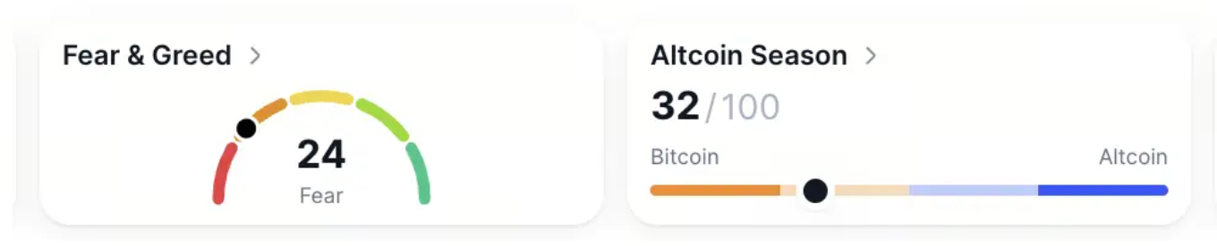 Chỉ số Fear and Greed tăng nhẹ lên 24, tăng từ mức sợ hãi sâu của tuần trước. Sự thống trị của Bitcoin tăng 0,02% lên 59,91%, cho thấy vốn đang tập trung vào các tài sản chính trong khi altcoin vẫn bị giới hạn trong phạm vi.