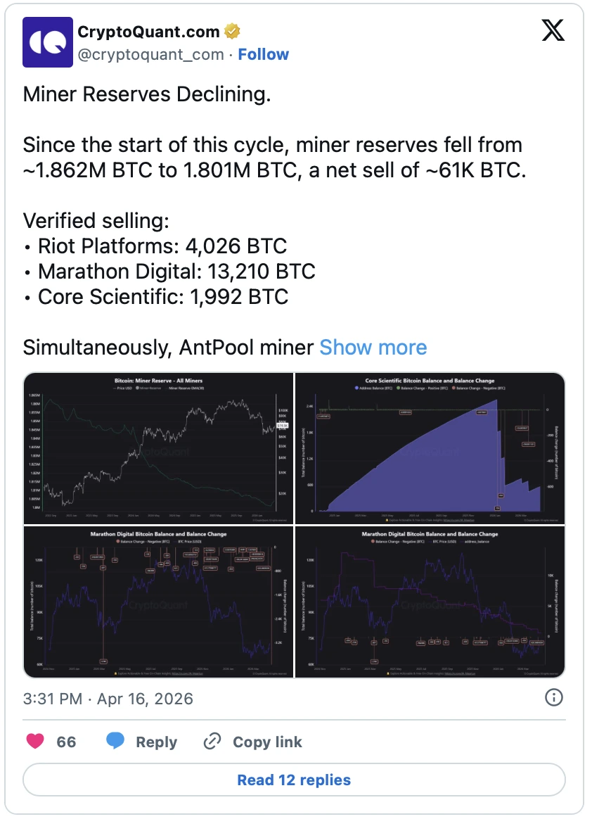 根據 CryptoQuant 引用的鏈上數據顯示,礦工儲備自周期高點下降約 61,000 枚 BTC,凸顯出分配行為的激進程度。