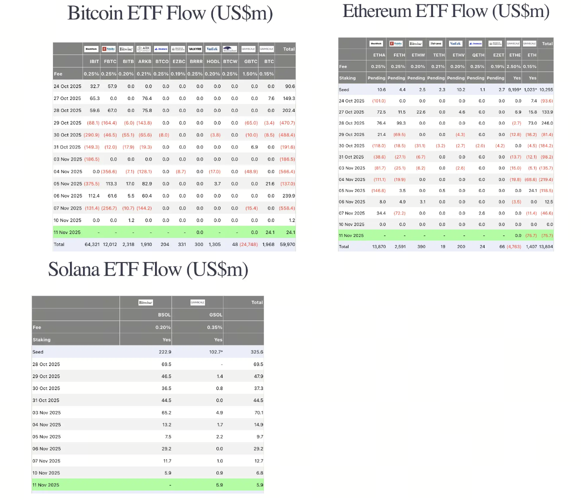 11月10日,BTC ETF錄得120萬美元的流入,ETH ETF保持平穩,而SOL ETF吸引了680萬美元。