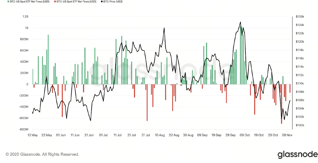 根據Glassnode的數據,美國比特幣ETF自10月初以來持續淨流出,平均每天約7億美元。數據顯示機構參與者普遍減少風險。