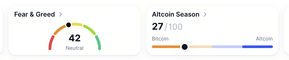 市場在本週的 FOMC 會議前謹慎交易,BTC 主導率穩定在 59.58%,山寨幣指數為 27,顯示風險情緒平穩。恐懼與貪婪指數上升至42,顯示經過數週波動後情緒有所恢復。